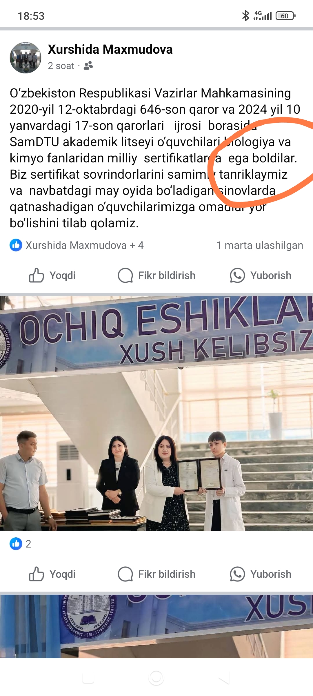 O‘zbekiston Respublikasi Vazirlar Mahkamasining 2020-yil 12-oktabrdagi 646-son qaror va 2024 yil 10 yanvardagi 17-son qarorlari ijrosi borasida SamDTU akademik litseyi o‘quvchilari biologiya va kimyo fanlaridan milliy sertifikatlarga ega boʼldilar. Biz sertifikat sovrindorlarini samimiy tabriklaymiz va navbatdagi may oyida bo‘ladigan sinovlarda qatnashadigan o‘quvchilarimizga omadlar yor bo‘lishini tilab qolamiz.