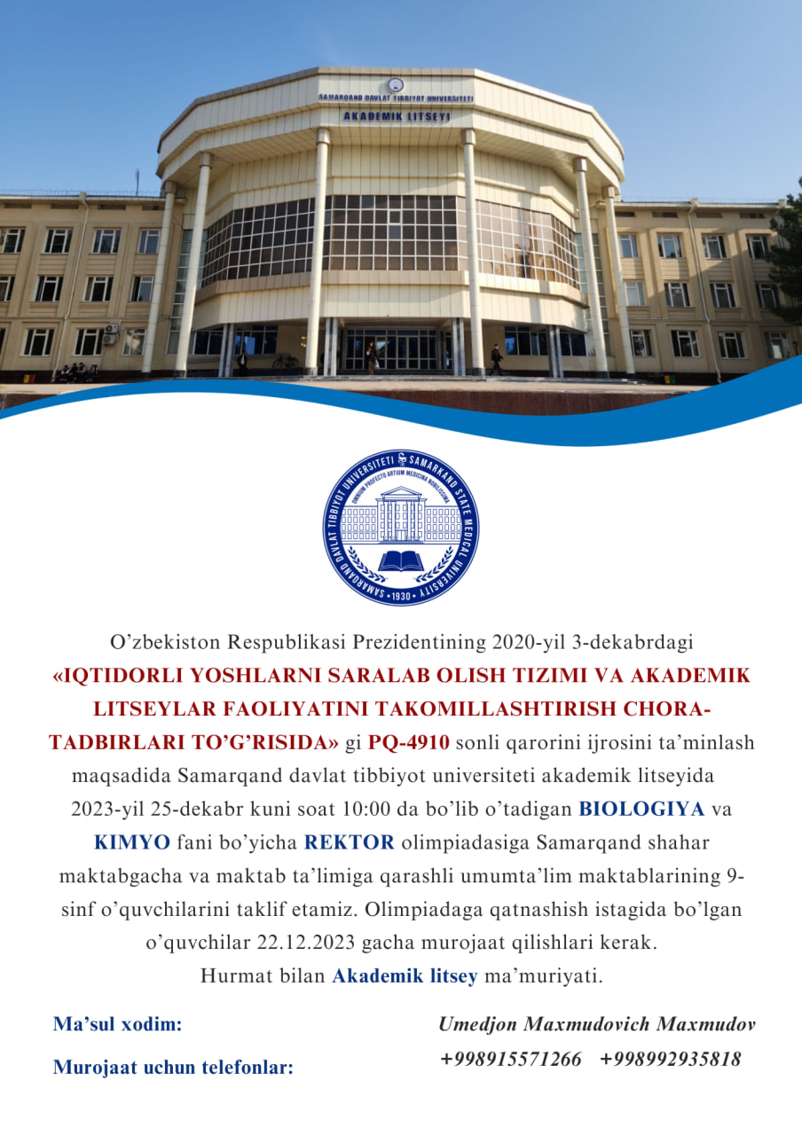 O’zbekiston Respublikasi Prezidentining 2020-yil 3-dekabrdagi «IQTIDORLI YOSHLARNI SARALAB OLISH TIZIMI VA AKADEMIK LITSEYLAR FAOLIYATINI TAKOMILLASHTIRISH CHORA-TADBIRLARI TO’G’RISIDA» gi PQ-4910 sonli qarorini ijrosini ta’minlash maqsadida Samarqand davlat tibbiyot universiteti akademik litseyida 2023-yil 25-dekabr kuni soat 10:00 da bo’lib o’tadigan BIOLOGIYA va KIMYO fani bo’yicha REKTOR olimpiadasiga Samarqand shahar maktabgacha va maktab ta’limiga qarashli umumta’lim maktablarining 9-sinf o’quvchilarini taklif etamiz. Olimpiadaga qatnashish istagida bo’lgan o’quvchilar 22.12.2023 gacha murojaat qilishlari kerak. Hurmat bilan Akademik litsey ma’muriyati. Ma’sul xodim: Umedjon Maxmudovich Maxmudov . Murojaat uchun telefonlar: +998915571266 +998992935818