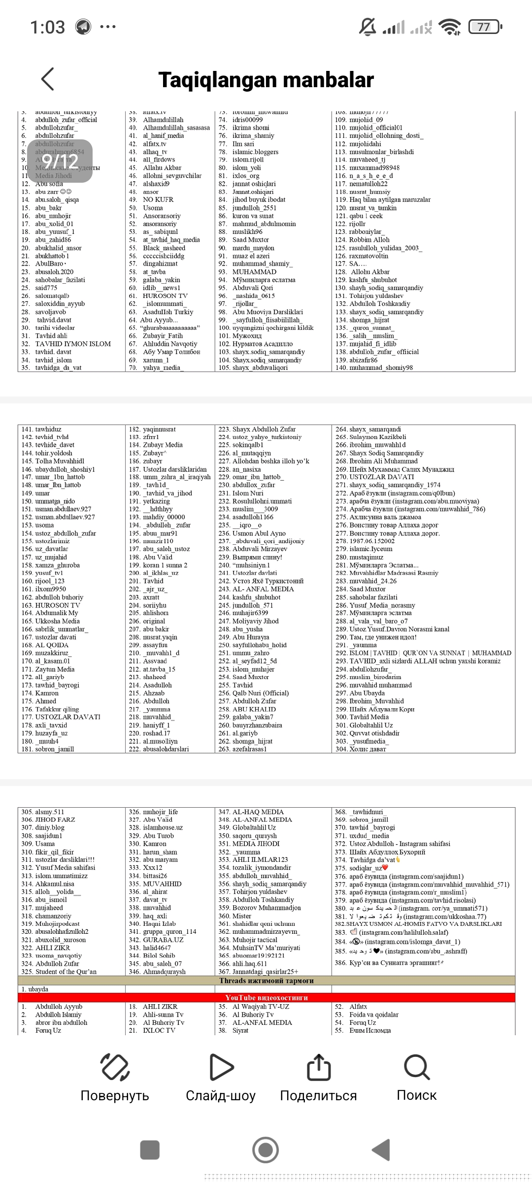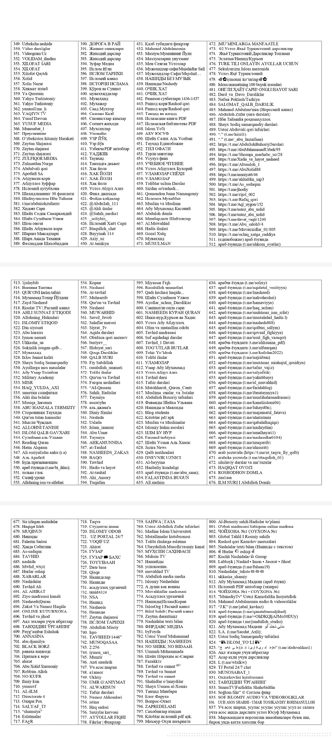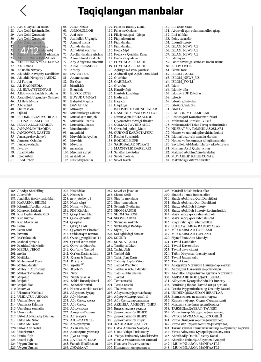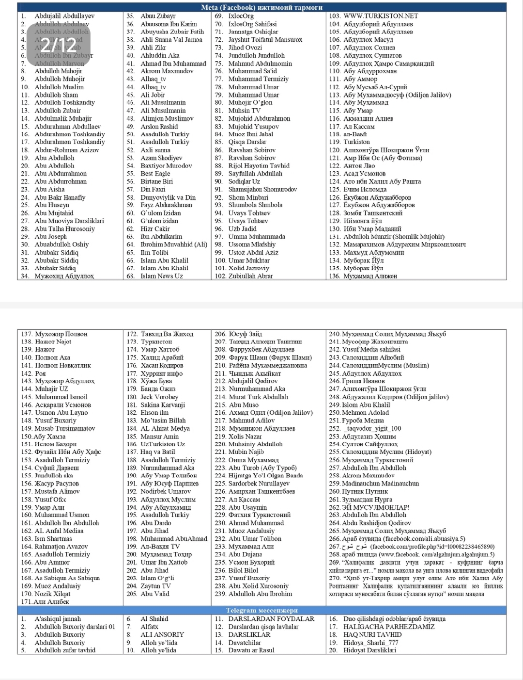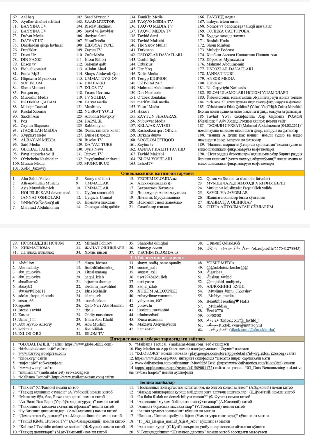 O‘zbekistonda taqiqlangan diniy materiallar ro‘yxati 🇺🇿Ushbu ro‘yxat O‘zbekiston Respublikasi Oliy sudi tomonidan tasdiqlangan. ‼️2026-yil aprel holatiga ko‘ra, O‘zbekiston hududiga olib kirish, tayyorlash, saqlash, tarqatish va namoyish etilishi taqiqlangan mazkur manba va kontent (material)lar Internet jahon tarmog‘idagi diniy ekstremistik, terroristik va aqidaparastlik g‘oyalari bilan yo‘g‘rilgan deb topilgan. ‼️Ijtimoiy tarmoqlarda ushbu ro‘yxatdagi guruh yoki kanallarga a’zo bo‘lish va kuzatish huquqiy javobgarlikka tortish uchun asos bo‘ladi. ⏺O‘zingiz va yaqinlaringiz xavfsizligi hamda kelajagiga befarq bo‘lmang!