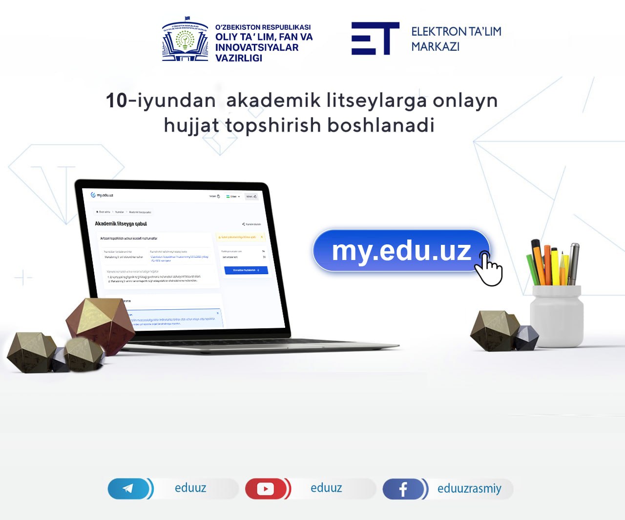 💬 Bugun, 10-iyundan 2024/2025 oʻquv yili uchun akademik litseylarga umumtaʼlim maktablarining joriy yil 9-sinf bitiruvchilaridan hujjatlarni my.edu.uz portali orqali onlayn qabul qilish boshlandi.