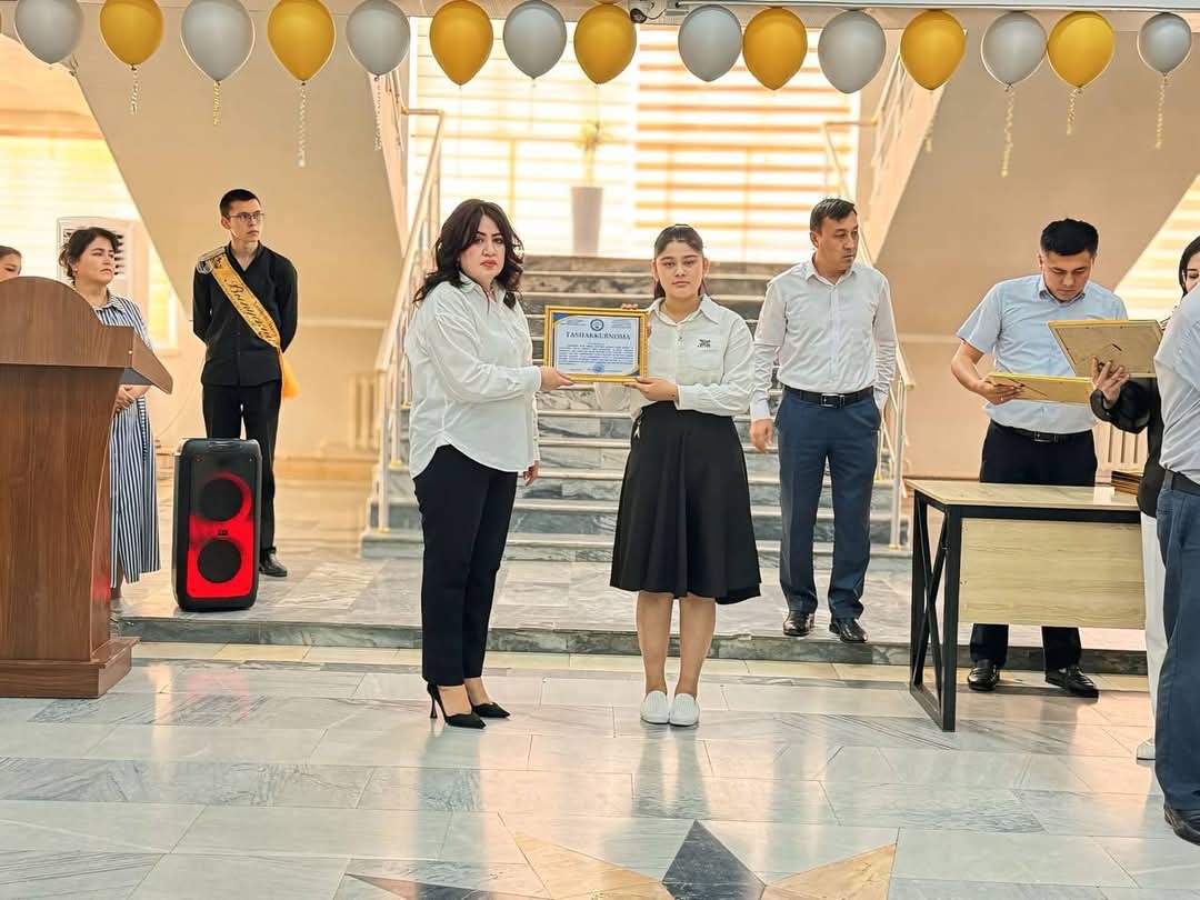 SamDTU akademik litseyida dars jarayonlari tugashi munosabati bilan so‘nggi qo‘ng‘iroq tadbiri o‘tkazildi. Tadbirda 2024-2025 o‘quv yili natijalariga ko‘ra, 1 va 2-bosqich namunali o‘quvchila hamda r ota onalariga litsey administratsiyasi tomonidan tashakkurnomalar berildi.Biz Uztozlar Litseyimiz bitiruvchilariga Oydin yo‘l va Porliq kelajak tilab qolamiz!