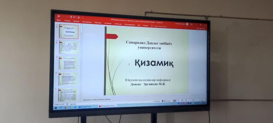 Samarqand Davlat Tibbiyot Universiteti akademik litseyida Universitet Yuqumli kasalliklar kafedrasi dotsenti Munisa Yakubovna Ergasheva tomonidan hozirda koʼp tarqalayotgan "Qizamiq kasalligi, uning alomatlari va davolash usullari hamda profilaktikasi" mavzusida litsey oʼquvchilariga maʼruza darsi oʼtildi.Maʼruza oʼquvchilarda katta qiziqish oʼygʼotdi, oʼquvchilar mavzu boʼyicha oʼzini qiziqtirgan barcha savollarga javob olishdi.